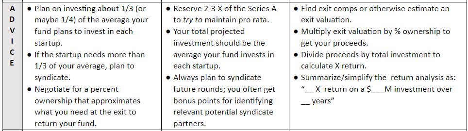 - Think of the seed deal as the chance to get in the deal early but use the projected Series A to calculate potential return.